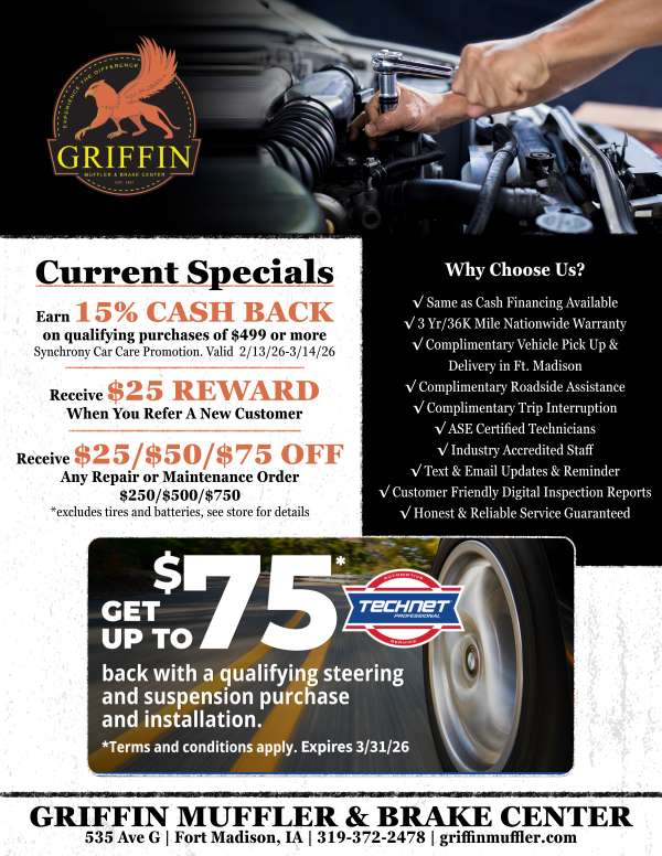 Griffin Muffler & Brake Center LLC is committed to ensuring effective communication and digital accessibility to all users. We are continually improving the user experience for everyone, and apply the relevant accessibility standards to achieve these goals. We welcome your feedback. Please call Griffin Muffler & Brake Center LLC (319) 372-2478 if you have any issues in accessing any area of our website.